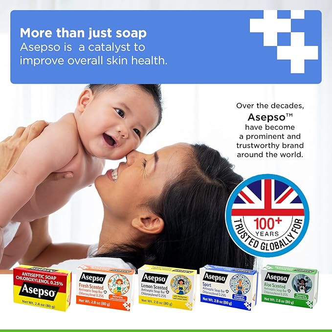 - LUXURIOUS LATHERING EXPERIENCE: Indulge in a luxurious washing experience with Asepso Antiseptic Soap, a trusted brand with over 100+ years in the marketplace. Featuring a rich, creamy lather that thoroughly cleanses while indulging your senses with a soothing aloe scent. Perfect for all skin types, this moisturizing soap helps prevent heat rash and skin rash, leaving your skin feeling pampered and refreshed after each use.