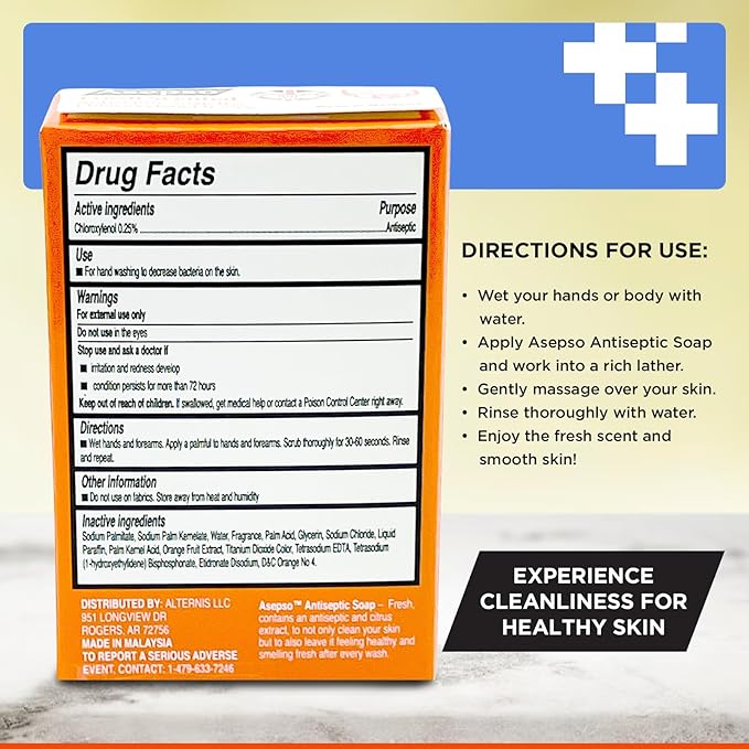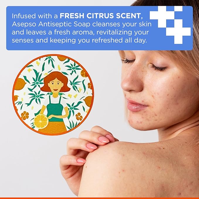 - INVIGORATING CITRUS SCENT: Infused with a vibrant fresh citrus aroma, Asepso Antiseptic Soap not only deeply cleanses your skin but also leaves a lingering, zesty fragrance. Energize your senses and enjoy the refreshing scent that keeps you feeling revitalized and rejuvenated throughout the day. Perfect for those seeking a combination of effective antibacterial protection and a delightful, long-lasting citrus scent.
