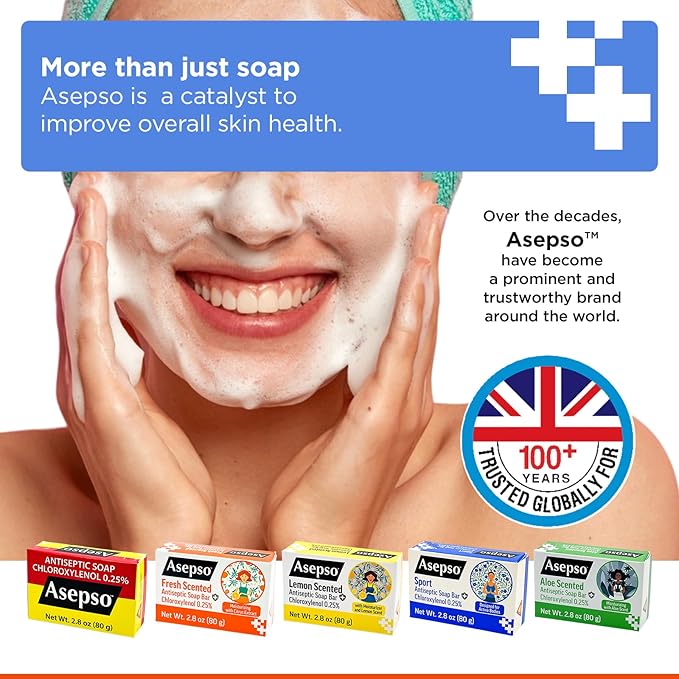 - HEALTHIER SKIN PROTECTION: Asepso Antiseptic Soap, formulated with powerful antiseptic ingredients & refreshing citrus extract, eliminates 99.99% of bacteria, including those causing Staph Infection, E. Coli, & Pneumonia. This antibacterial soap promotes healthier, more radiant skin by reducing the risk of infections, heat rash, & skin rash, leaving your skin feeling refreshed and rejuvenated. Perfect for daily use, Asepso Antiseptic Soap is your go-to solution for optimal skin health & hygiene